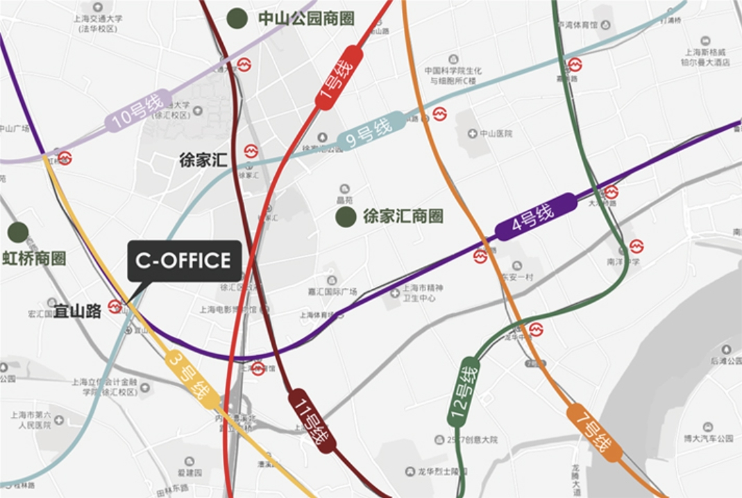 地鐵3號線、4號線、9號線交匯于宜山路站,地鐵3號口旁100米